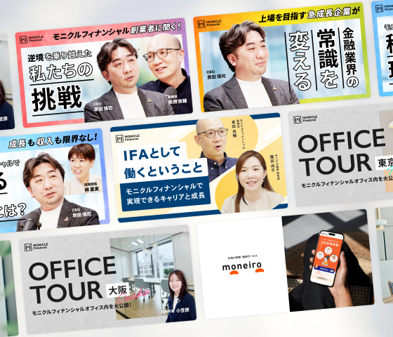 CEO原田による事業戦略や報酬制度、キャリアパスの解説に加え、現場で活躍するファイナンシャルアドバイザーのインタビュー、オフィスツアーを通じた社内カルチャー紹介など、モニクルフィナンシャルのリアルを動画でお届けします。